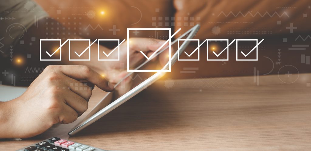 Businessman working with tablet. Checking mark up on the check boxes. Successful completion of business tasks. Digital marketing of statistics level up of graph. Business management goal strategy.