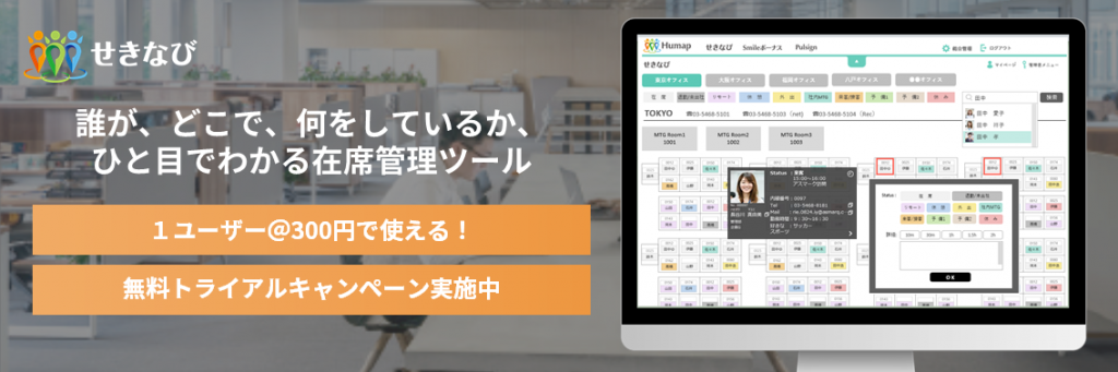 その際、「せきなび」などの在席管理ツールの活用も併せて考えてみましょう。「どこに誰がいるのか・勤務しているのかがわかりづらく、マネジメントしにくい」といったABWのデメリットが解消されるからです。