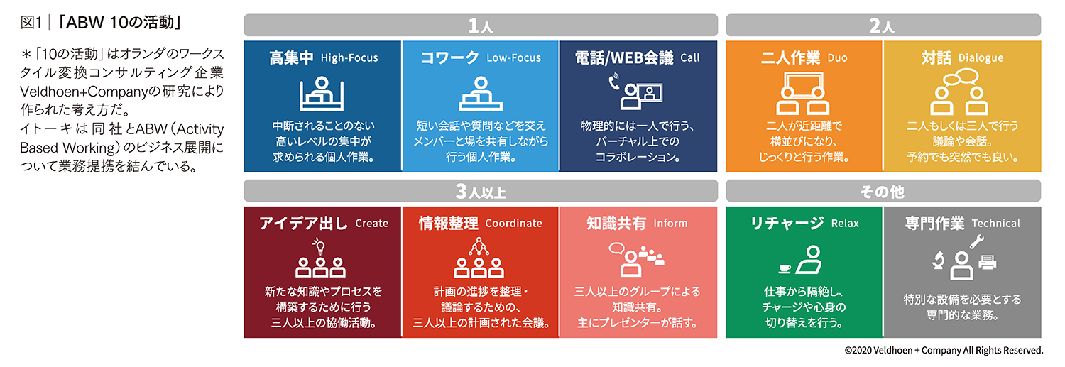 以下の「10の活動」を参考するとよいでしょう。この10の活動のうち、オフィスで行うことを想定するならば、それがオフィスとして必要な要件となります。(https://www.asmarq.co.jp/column/hr/freeaddress-point/ の「複数のタイプの座席を用意し居心地のよいオフィスにする」も参照ください)