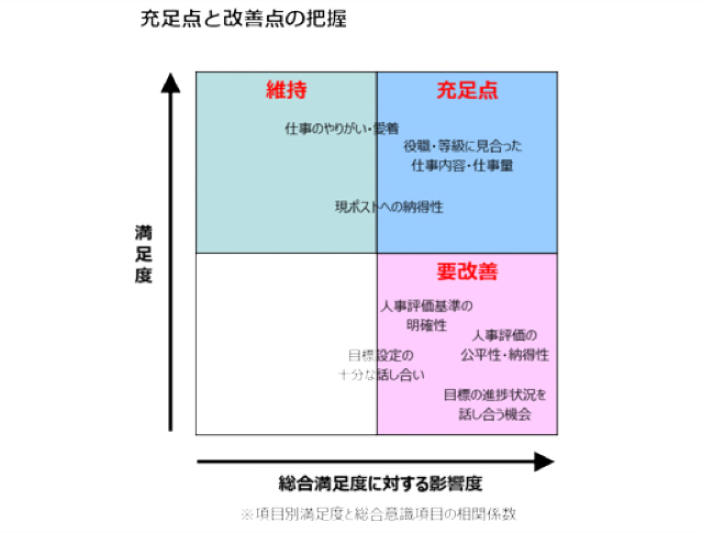 また、顧客ロイヤリティの源泉や改善すべき事項を把握するために、顧客満足度調査(CS調査)の調査項目の中にNPS®が測れる設問を組み込むことが一般的です。何に満足し、何に不満を抱えているのかを把握することで、NPS®へ影響する因子が判明し改善へ繋げることができます。顧客満足度調査でよく行なうポートフォリオ分析(CSポートフォリオ分析)により、製品やサービスの「満足度」と「満足度への影響度」に基づいた充足点や改善点を把握し、「優先的改善事項」を明確にすることができるでしょう。