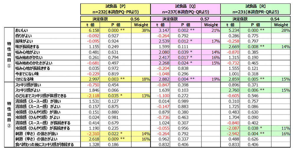 下記の例の場合は、購入意向という目的変数(=一つの目的)に対して、影響を与えそうな評価項目として、「おいしい」「香りがよい」~「食べ終わった後にスッキリ感が持続する」までの22項目が説明変数(複数の評価項目)として挙げられ、それぞれが購入意向に対してどのくらい影響するのかを分析しています。