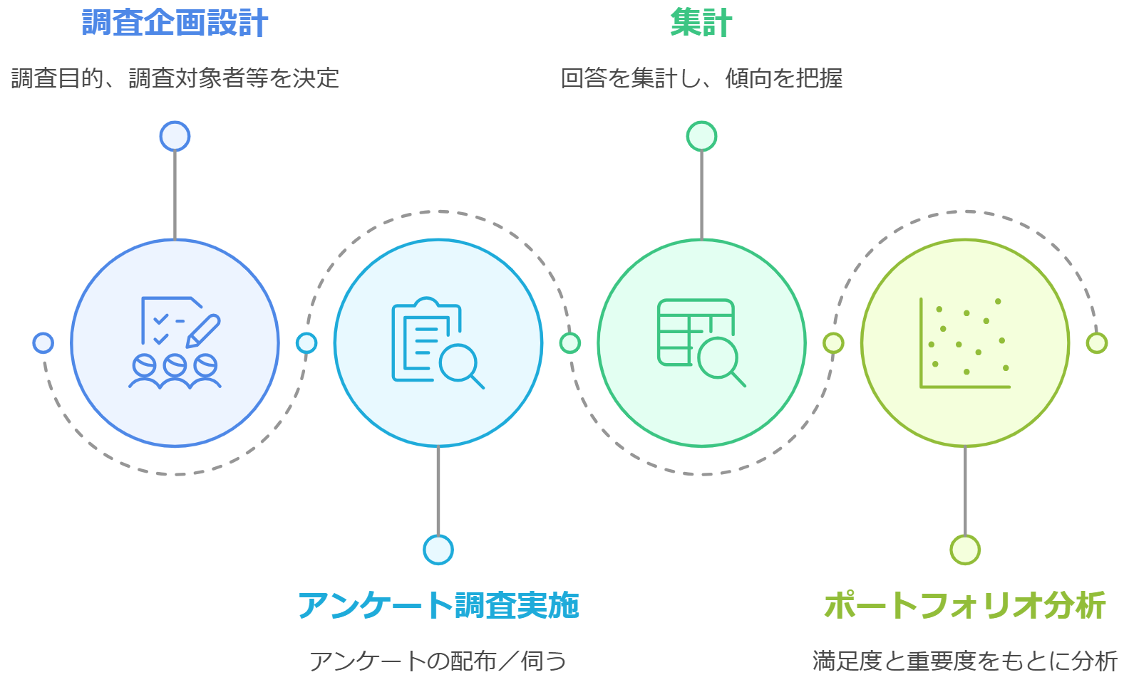 ポートフォリオ分析を実施するには、収集した回答データを適切に処理し、「満足度」と「重要度」を定量的に評価することが重要です。ポートフォリオ分析の具体的な手順は以下の通りです。