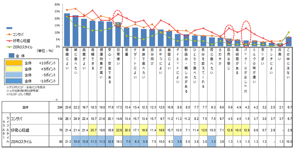 商品の「購入意向」と「特性(評価)項目」から、「購入意向」へ影響を与える条件の組み合わせを把握する。