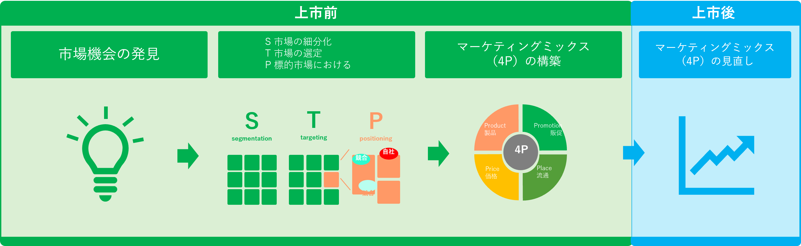 自社の理想とするポジショニングを確立するためには、商品自体の機能開発はもちろん、価格はいくらに設定するのか、どのようなプロモーションを打つのか、どこでどのような手法で販売するのかなどを決める必要があります。