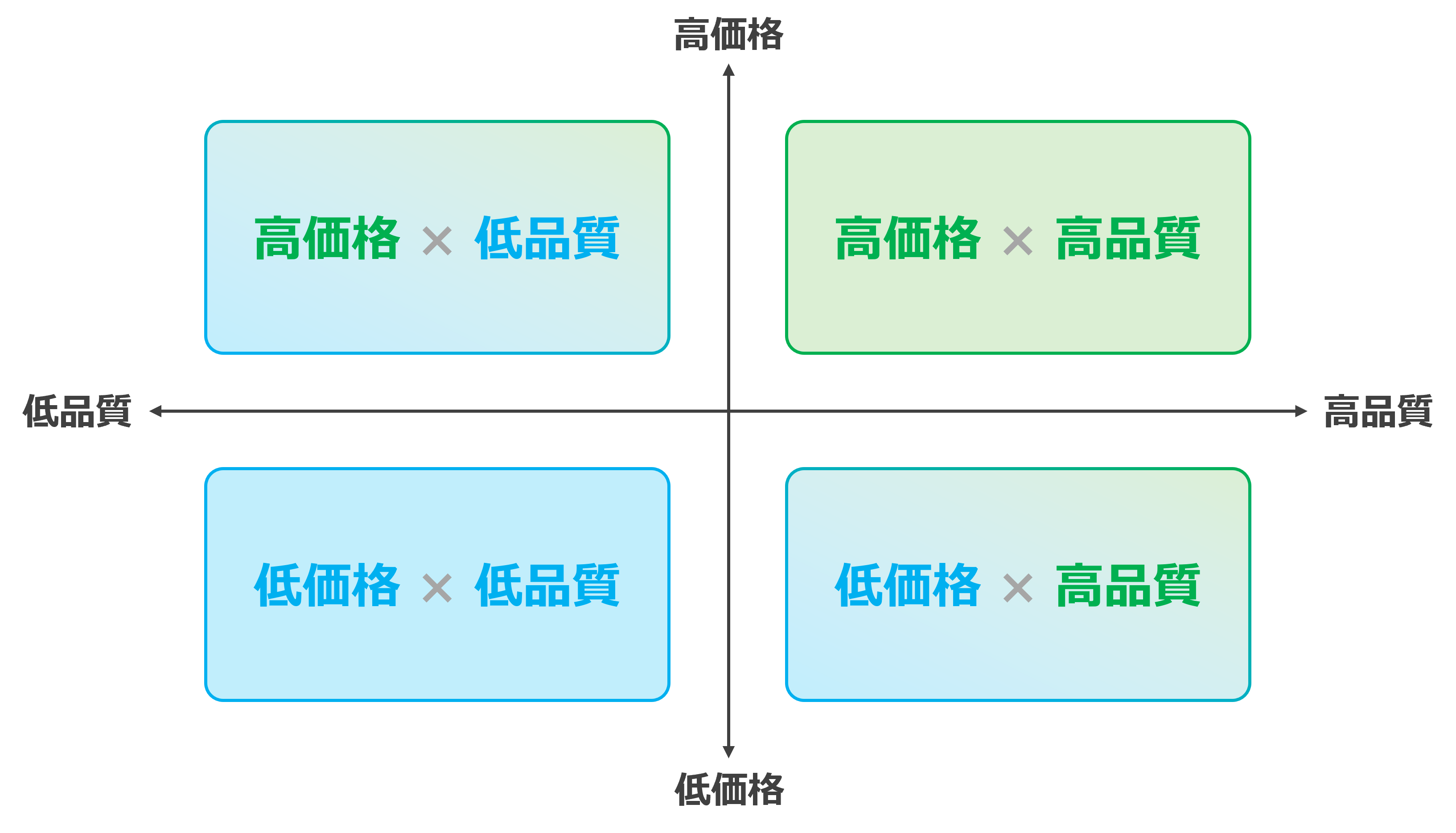 下図のようなポジショニングマップを用いるのが一般的で、マップの2軸に「値段」「品質」「店舗数」などをあてはめ、それぞれを競合と比較していきます。このポジショニングマップを使うことで、自社の立ち位置を可視化しながら分析できる点がメリットと言えるでしょう。
