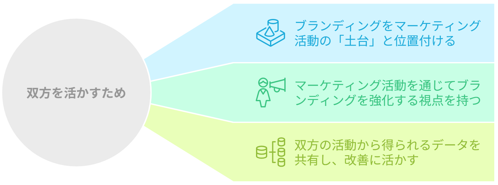 さらに、双方の活動から得られるデータを共有し、改善に活かすことも重要なポイントです。マーケティング活動で得られた顧客の反応や購買データは、詳細なリサーチを通じてブランディング戦略の見直しに役立ちます。その一方で、ブランドに対する顧客の感情や認知度の変化は、次のマーケティング施策の方向性を決定する上で貴重な情報となります。