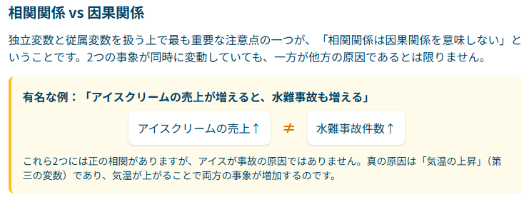 例えば、「アイスクリームの売上が増えると、水難事故も増える」という現象は相関関係があるかもしれませんが、アイスクリームが水難事故の原因ではありません(実際には気温という共通の原因があるかもしれません)。相関関係があっても、必ずしも因果関係があるとは限りません。独立変数と従属変数という言葉は、因果関係を想定して用いられることが多いですが、観察研究などでは相関関係の強さを分析することもあります。