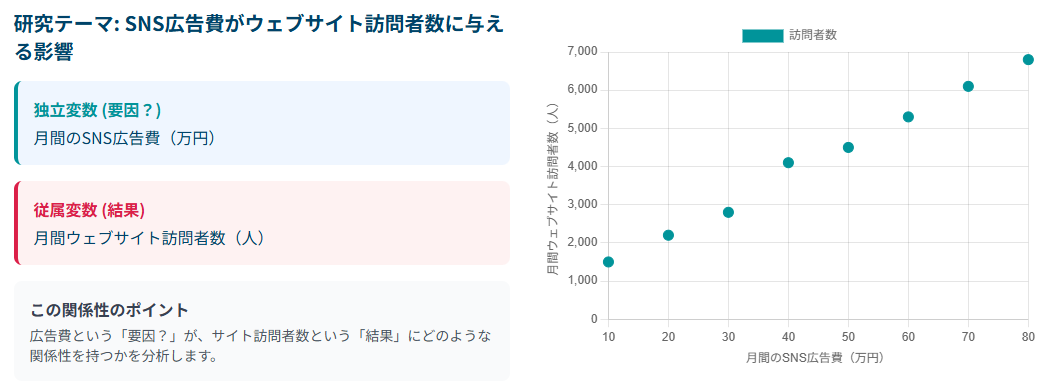 解説 :SNS広告費とウェブサイト訪問者数を分析する際、SNS広告費は操作可能な独立変数、その結果として測定されるウェブサイト訪問者数が従属変数です。これは、マーケティングにおいて非常に重要な視点となります。
