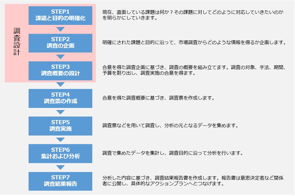 市場調査を行う際、どのような調査内容にするかを決めるのが「調査設計」です。調査設計を建築で例えるなら、「設計書づくり」にあたります。調査設計は「市場調査の流れ」におけるSTEP1~3に該当します。調査設計は調査全体に及ぼす影響がとても大きい作業です。良い市場調査を実施できるかは、調査設計によって大部分が決まるといっても過言ではありません。