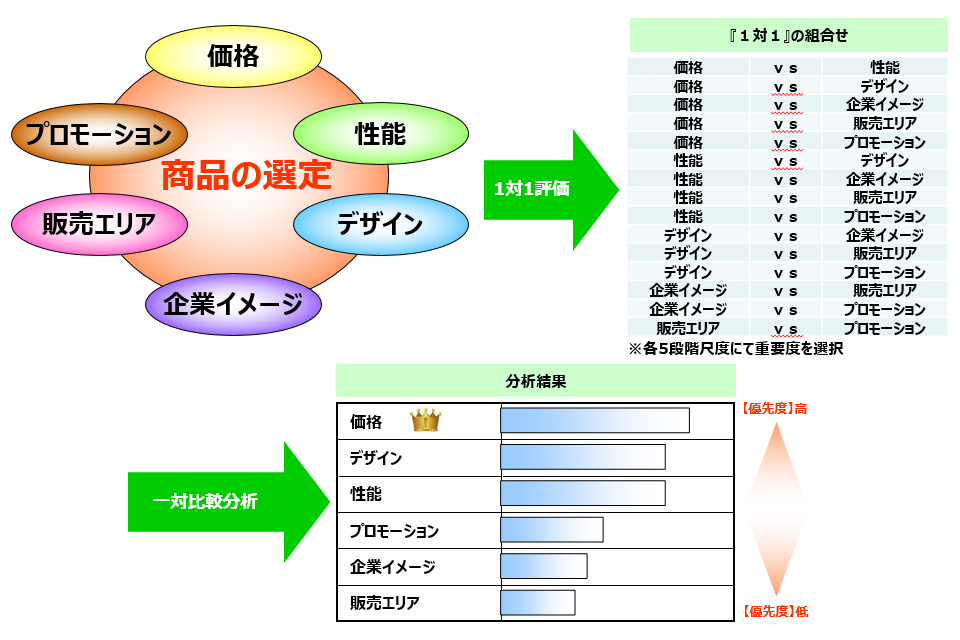 複数ある項目を『1対1』で比較し、項目間の順位(優先度)を明確に把握する分析手法です。