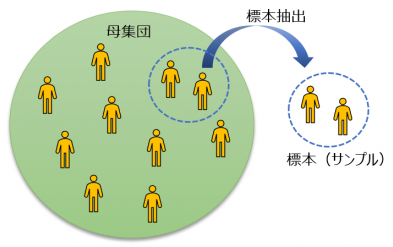 標本調査とは全体調査と対をなす調査のことで、母集団から標本(サンプル)を抽出して、母集団の性質を推定する方法です。