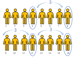 ↓ 抽出された数を基準に「n個飛ばし」で標本を抽出する 例では、抽出された「4」を基準に「3個飛ばし」で、等間隔に標本を抽出している |