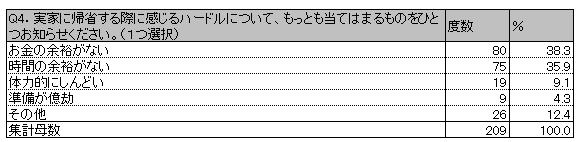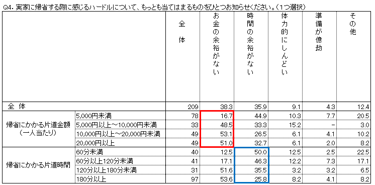 図6のQ4は、理想的な帰省頻度と比べて実際の帰省頻度が低い方に対して、何がハードルとなっているのかを聴取した設問です。Q4の単純集計の結果から、[お金の余裕がない(38.3%)][時間の余裕がない(35.9%)]が主な帰省のハードルになっていることが分かります。