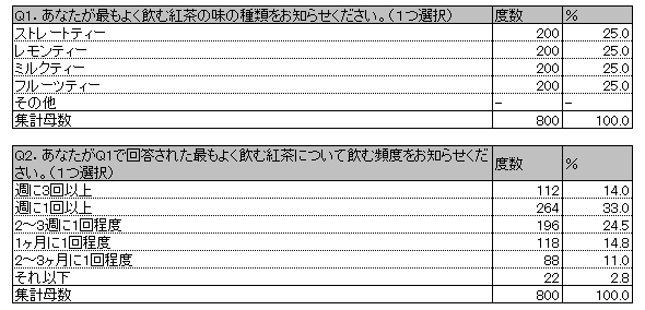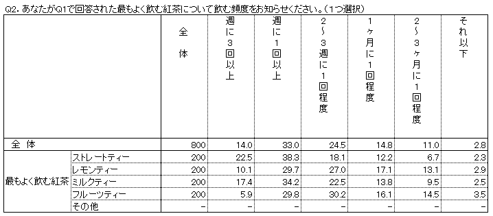 図3のQ2の設問はQ1の設問で選択した紅茶の種類に対して、飲用頻度を回答する単一回答(SA)の設問です。Q2を単純集計したとしても、どの紅茶の種類に対して飲用頻度を回答されているのかは分からない状態です。そこで、図4のようにQ1を集計軸としてQ2とクロス集計をすると、Q1で選んだ紅茶の種類ごとに、回答結果を確認することが可能になります。このように前問の回答結果によって何を対象として回答するのかが変わる設問は、設問間クロス集計をよく用います。