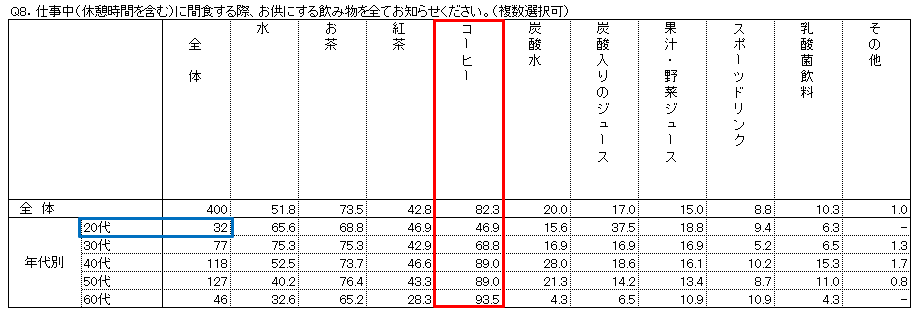 図5のQ8は、仕事中に間食する際のお供にする飲み物の種類を聴取した複数回答(MA)の設問です。赤枠の選択肢4「コーヒー」の結果を見てみましょう。オフィス勤務時、在宅勤務時、どちらでも間食をしている400人のうち、8割の方が間食時にコーヒーを飲んでおり、年代が上がるにつれてコーヒーを飲む方が増加傾向であることが分かります。よって、仕事中に間食する際の飲み物と年代には相関関係があると言えるでしょう。