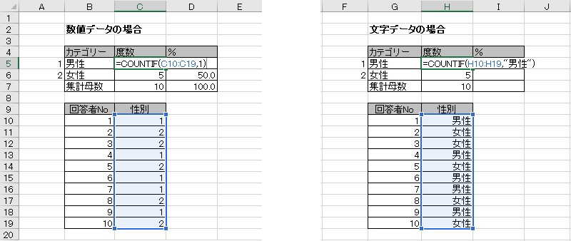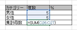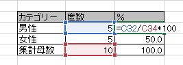 全体の人数(集計母数)のうち、男性の割合を求める場合は、セルに【=男性の数(度数)/全体の人数(集計母数)*100】と入力すると算出できます。