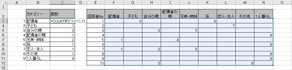 [配偶者]と回答した人数をカウントする場合、セルに【=COUNTIF( 範囲:該当質問の列すべて(F~N列) , 検索条件:「1」 )】と入力します。