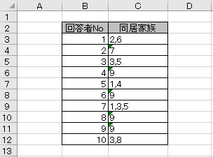 複数回答質問も単一回答質問と同じく1列になっており、チェックした選択肢の番号が、セル内にカンマ(コンマ)区切りで入力される
