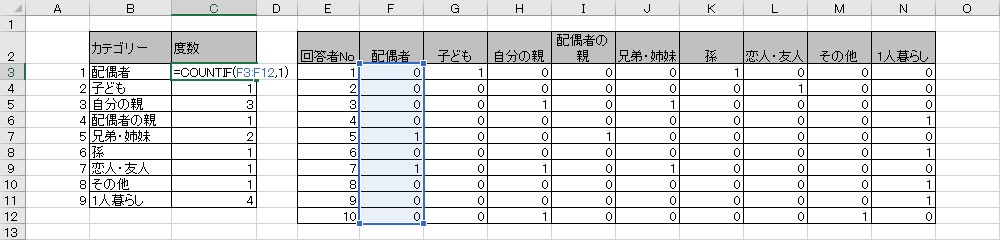 [配偶者]と回答した人数をカウントする場合、セルに【=COUNTIF( 範囲:配偶者の列(F列) , 検索条件:「1」 )】と入力します。