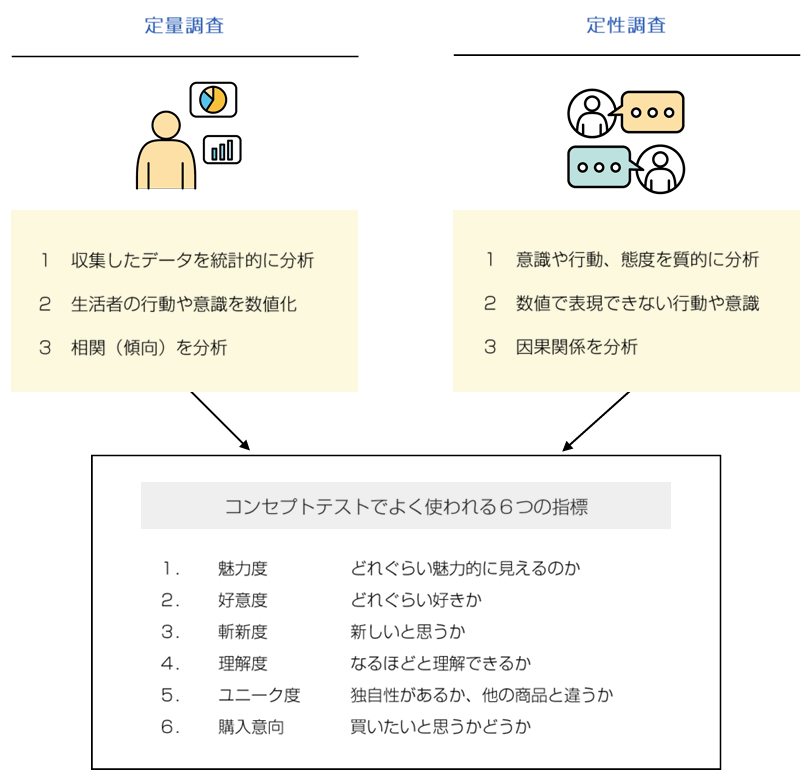ここで、コンセプトテストにおける「定量調査とは?」「定性調査とは?」という部分も解説をしていきます。