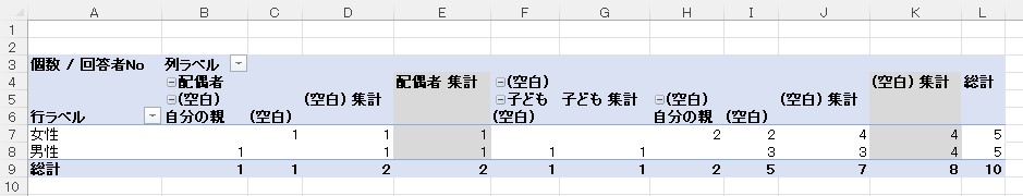 あとから『行ラベル』『列ラベル』を修正することもできますが、文字データだとラベルが最初から文字になっているので便利です。文字データを持っている方はそのまま集計してみましょう。