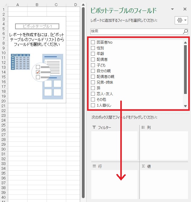 『ピボットテーブルのフィールド』がポップアップされたら、『フィールドリスト』(赤枠)にある[性別](単一回答)を行ボックスへ、[職種](単一回答)を列ボックスへ、[回答者No]などの適当なフィールドを値ボックスにドラッグします。