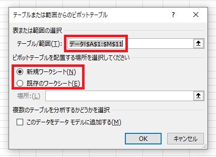 『テーブルまたは範囲からのピボットテーブル』シートがポップアップされたら、集計したいデータ全体の範囲を選択します。そして、『ピボットテーブルを配置する場所を選択してください』は、お好みで『新規ワークシート』か『既存のワークシート』を選択します。選び終えたら、OKを選択します。