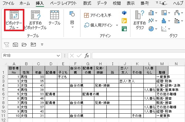 データを保存したエクセルを開き、『挿入』タブにある『ピボットテーブル』を選択します。