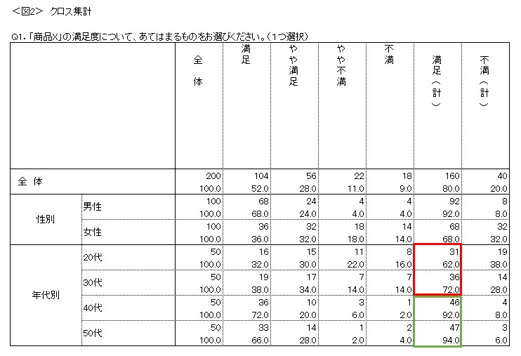 クロス集計を行ったところ、「商品X」がターゲットとしている20代の満足度(満足+やや満足)は62%、30代は72%であることが分かりました(図2赤枠)。