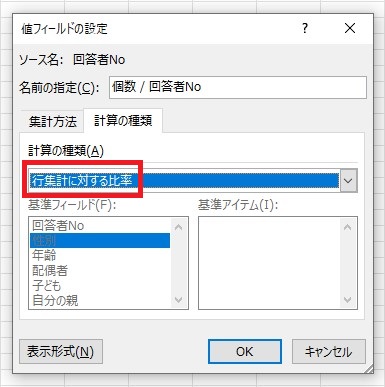 パーセンテージを確認したい場合は、STEP5でポップアップした『値フィールドの設定』シートを再び表示し、『計算の種類』タブの計算の種類を『行集計に対する比率』に変更してください。選び終えたら、OKを選択します。