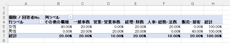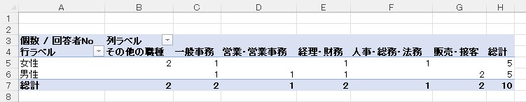 これで単一回答質問(SA)同士のクロス集計が完成しました。行・列ラベルともに五十音順に表示されます。