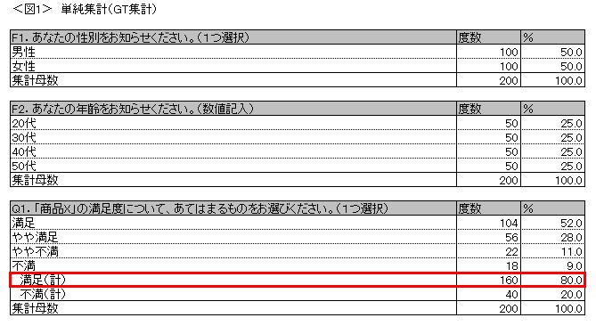 その結果、「商品X」について、満足と回答した割合(満足+やや満足=「満足(計)」)は、「80%」であることが分かりました(図1赤枠)。