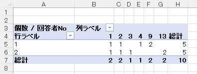 数値データで同じ集計をすると下記のように『行ラベル』『列ラベル』がそれぞれ選択肢番号になります。行・列ラベルは昇順に表示されます。