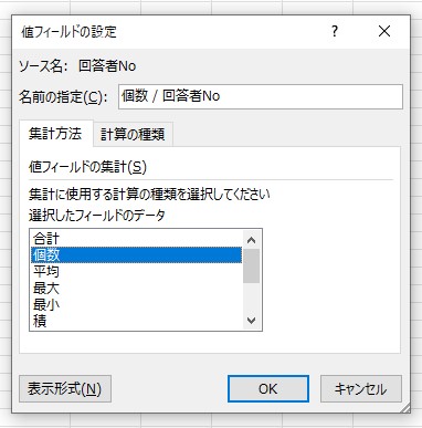 『値フィールドの設定』シートがポップアップされたら、『集計方法』タブの集計に使用する計算の種類を『個数』に変更してください。初期設定では『合計』になっていますので、『個数』にして各選択肢の選択個数がカウントされるように設定を変更する必要があります。