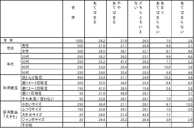 クロス集計表の「全体」は、単純集計表と同じ結果を表しています。また、「全体」には、様々な属性の人が含まれており、例えば、性別では「男性か女性」、年代では「20代か30代、40代、50代」といった具合です。そのため、「属性ごとにどのような傾向の違いがあるのか」などを把握するため、これらの項目、いわゆる「集計軸」と呼ばれる軸を設定する必要があります。