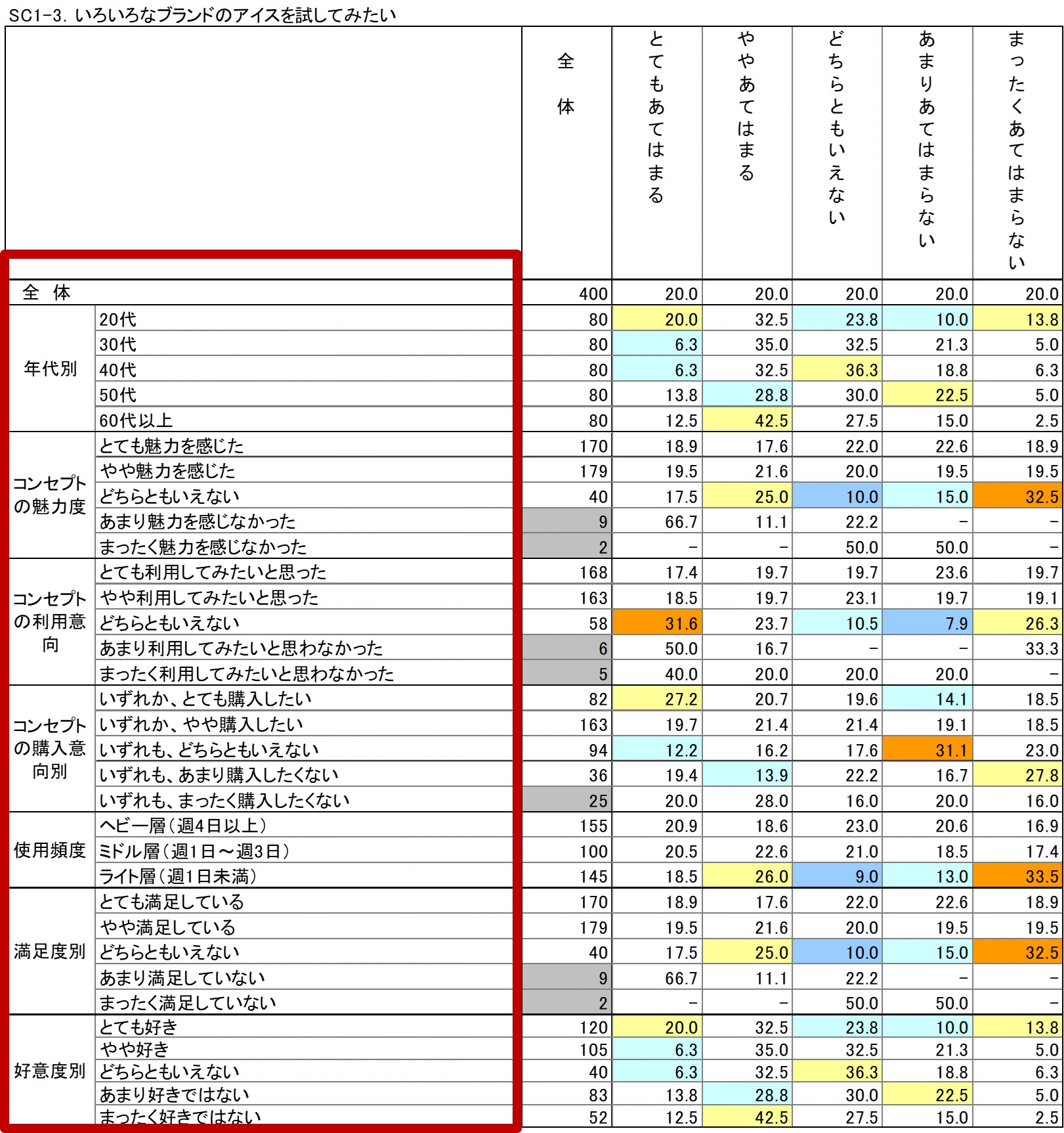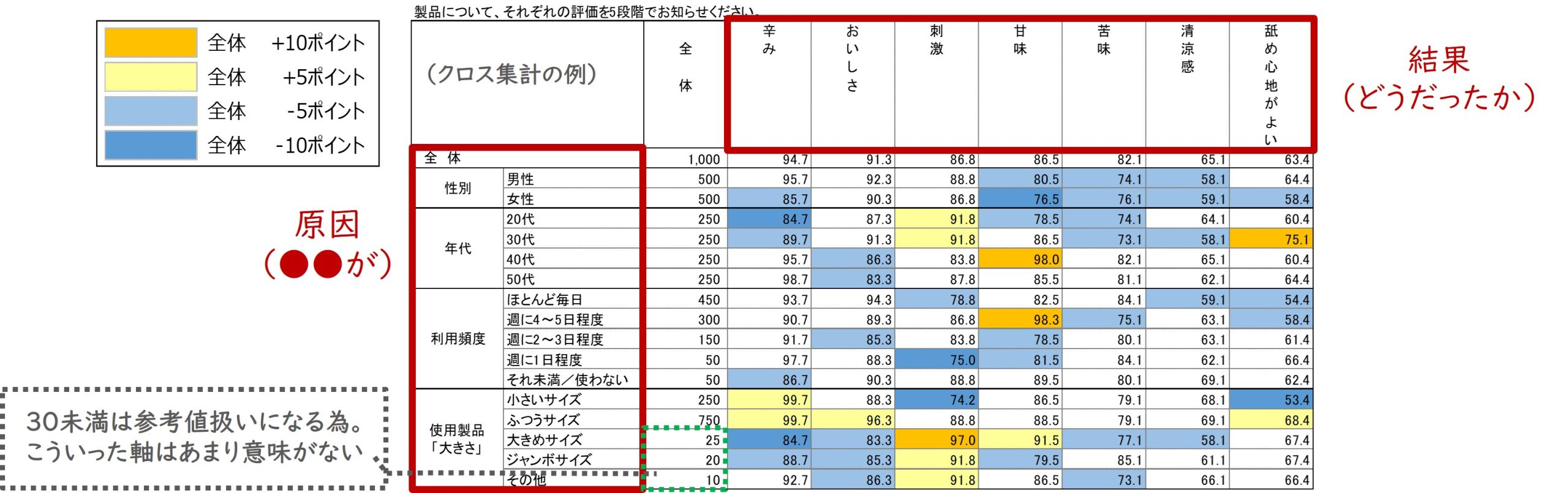 このように、検証したい仮説によって集計軸を設定することで、結果の違いを解釈していきます。