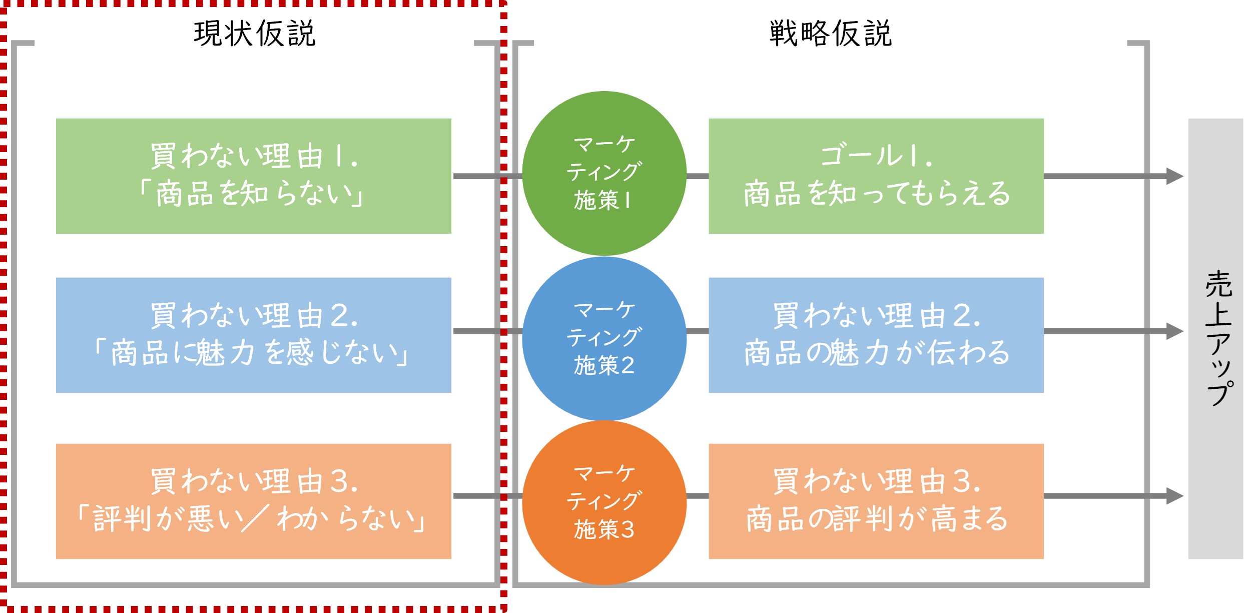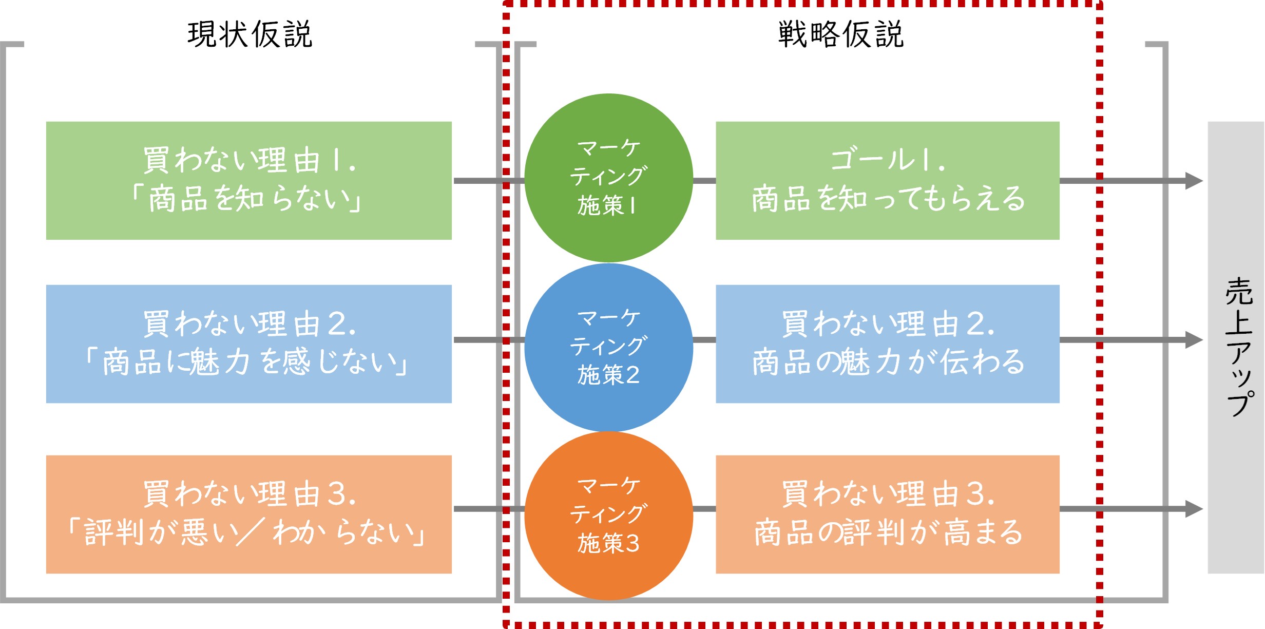 戦略仮説は、現在抱えている課題に関する問題点を解決するために、「こうすればきっとうまくいくのではないだろうか」という過程を示していく方法になります。