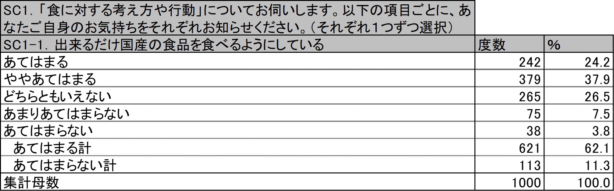 単純集計表は、各設問に1つ1つの全体の結果を示し、人数を表す度数と割合を表すパーセントで表記されています。この表は、調査結果の全体像を把握するときに有効で、クロス集計表で詳細を確認する前に見るようにしましょう。