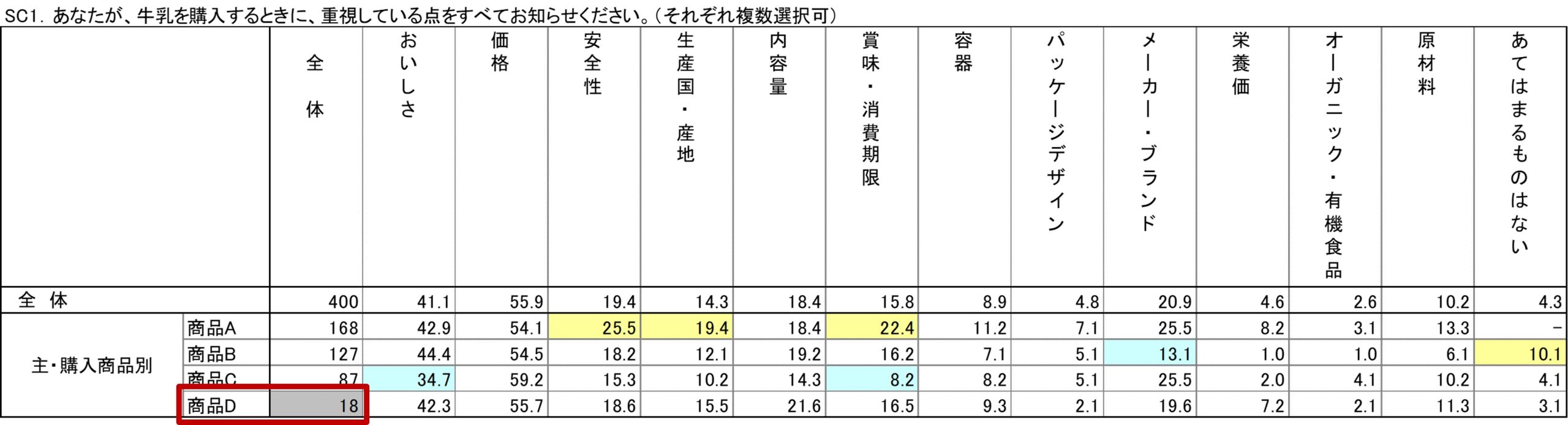 この図で商品Dの「全体」の数値を赤で囲っておりますが、統計上基準となり得る30サンプルを下回っており、ぶれが大きくなる数値となるため、基本的には参考値として比較を行えません。そのため、商品Aと商品Dの違いが把握できないということになります。