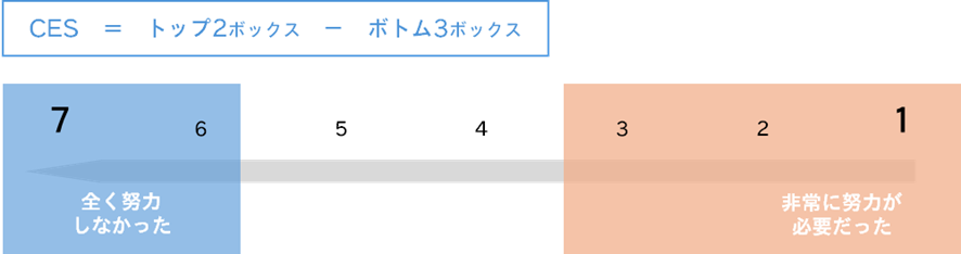 算出方法は、「サービスを利用する際、努力が必要でしたか?」「商品を使用するときにストレスを感じましたか?」のようなアンケート設問を用意し、回答データに対し、上位2区分の得票率から下位3区分の得票率を差し引くことで計算できます。