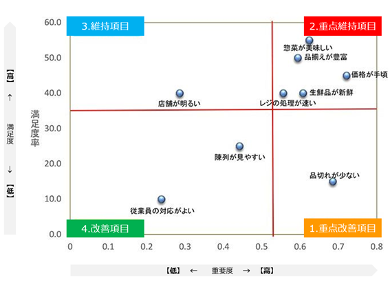 製品やサービスの「満足度」と「重要(期待)度」からマッピングし『優先的改善項目』を把握する分析手法です。