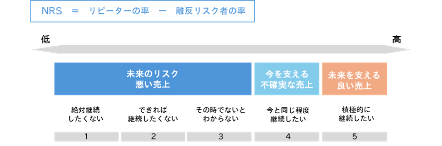 NRSとは、「Net Repeater Score(ネットリピータースコア)」の略で、NPS®が推奨意向であったのに対し、こちらは「継続利用の意向」をロイヤリティーの指標としています。