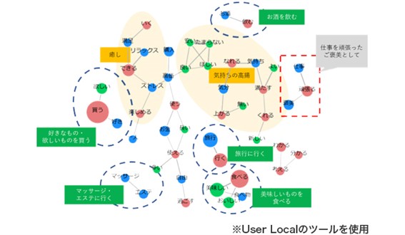 数値などの形であらわされる定量データに対し、自由回答(FA)などの単語の羅列や文章として表されるテキストデータは定性データと呼ばれ、数値で測れない感情的な側面を持ちます。テキストマイニングにより、単語が持つ意味や繋がりを可視化することができるため、感情分析やペルソナ構築のひとつとしても用いられ、マーケティングやブランディングの方向性の舵取りにも大いに役立てることができます。