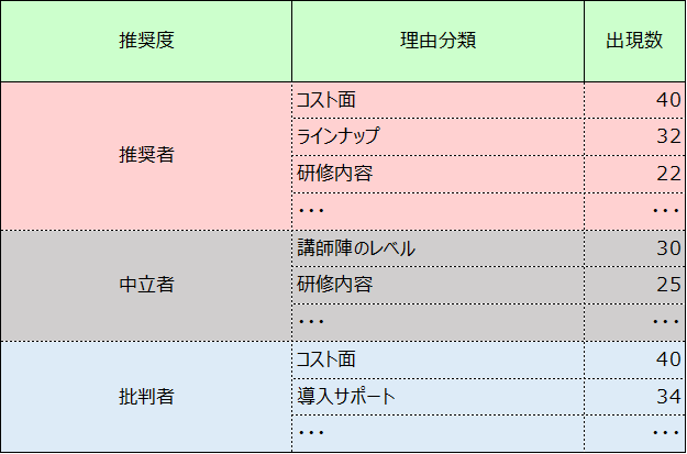 また、NPS®と組み合わせることもできます。「推奨者」「中立者」「批判者」ごとに分析して、傾向をつかむといった方法もあり、イメージが下図となります。