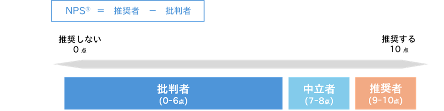 NPS®とは、「Net Promoter Score(ネットプロモータースコア)」の略であり、顧客ロイヤリティ(ブランドや商品、またはサービスに対する「信頼・愛着」のこと)を計測するための指標のことです。他人への推奨度(どれぐらいお薦めしたいのか)を算出することで、顧客ロイヤリティを可視化することができます。