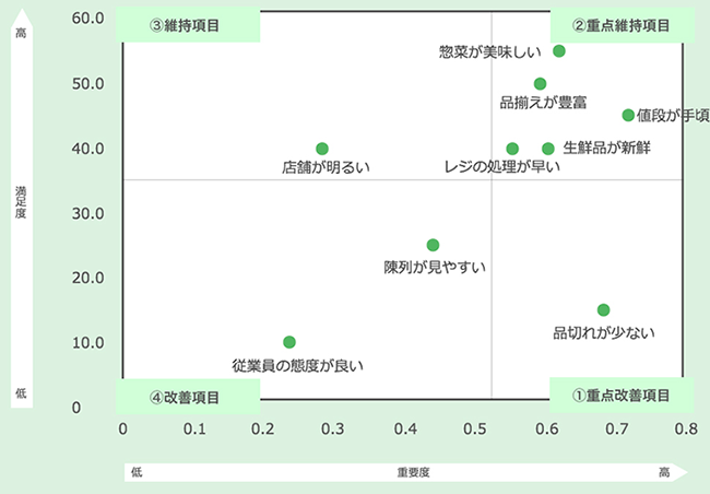 ブランドの「重要度」を横軸に、「満足度」を縦軸に取り、改善項目への優先度をポジショニングから視覚的に把握することができ、『重点改善項目』『重点維持項目』『維持項目』『改善項目』の4象限に大別されます。