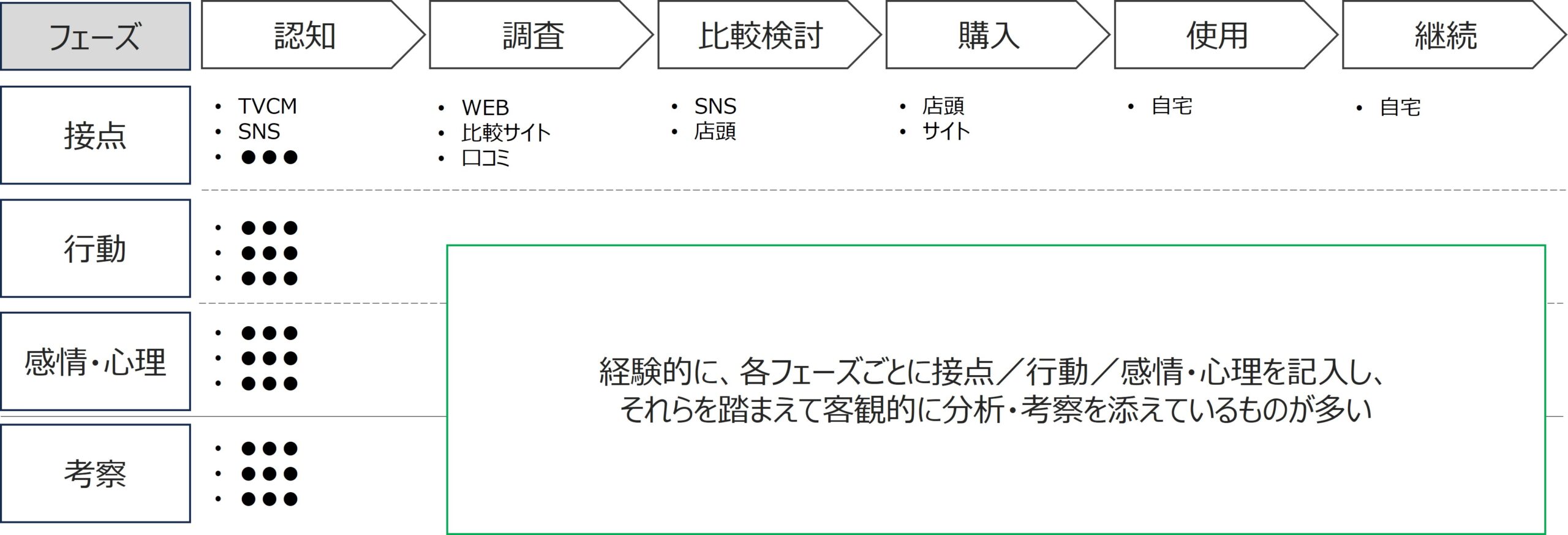 では、縦軸はどうでしょうか。このイメージでは接点、行動、感情・心理、考察と並んでおり、これらの項目についての使い方を下表にまとめます。