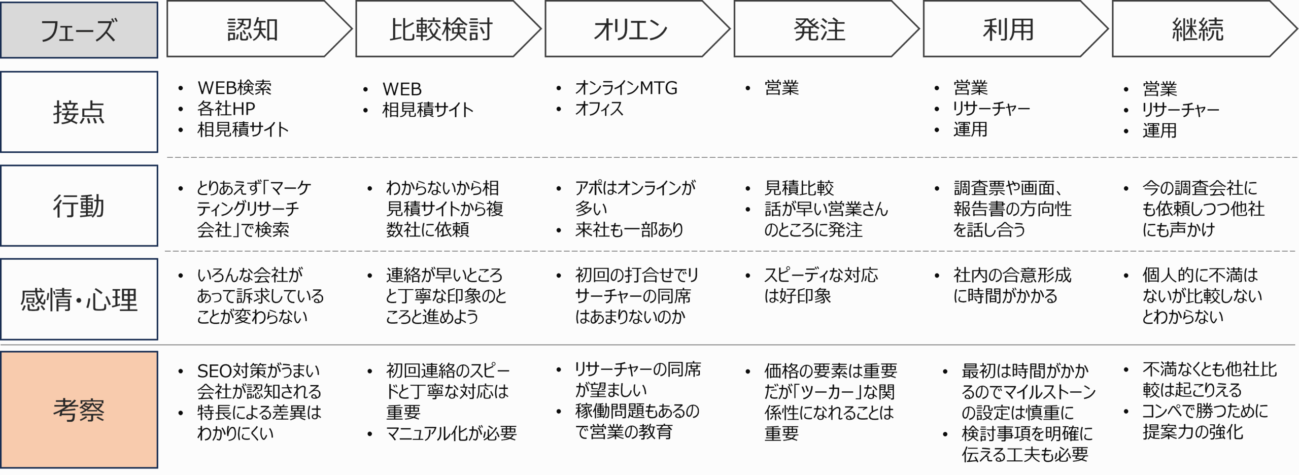 このマップを作成するまでの流れとして、まずデプスインタビューで得られた情報を各フェーズに記載していきます。もし、「『マーケティングリサーチ会社』と検索をして、色んな会社のHPを見た」という意見があれば、「認知」の「接点」に「WEB検索」や「各社HP」を記載しつつ、「行動」に「とりあえず「マーケティングリサーチ会社」で検索」と記載していきます。