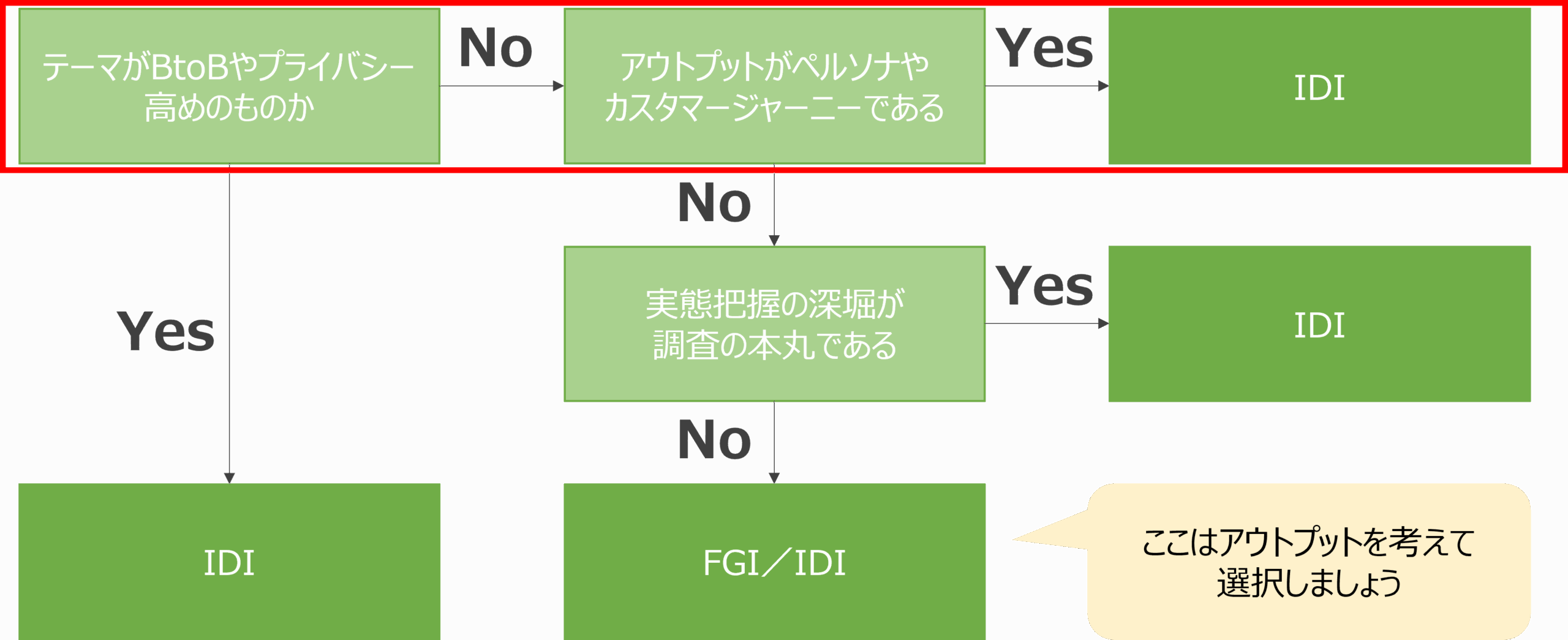 こういった異なる特徴があるので、調査目的に応じたインタビュー手法を選択する必要があり、その選択方法を下図にまとめました。