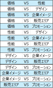 例えば、あるジャンルの商品の選定に対し、『価格』や『デザイン』、『性能』といった項目をどれだけ重視するか、優先度を把握したい場合、回答者に下表の組み合わせ分質問し、それぞれ5段階尺度で選択していただきます。